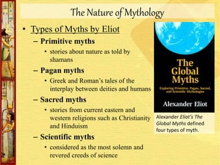 Myths attempt to explain natural phenomena. What are characteristics of Mythology. Myth serves to interpret the whole of human.